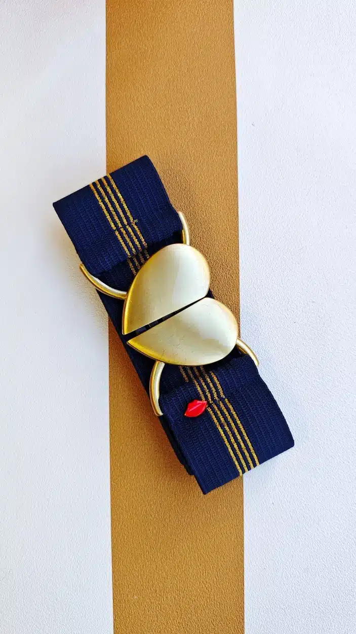 Sublimez votre tenue avec la ceinture élastique marine et or Norma et apportez une touche d’originalité unique à votre look.