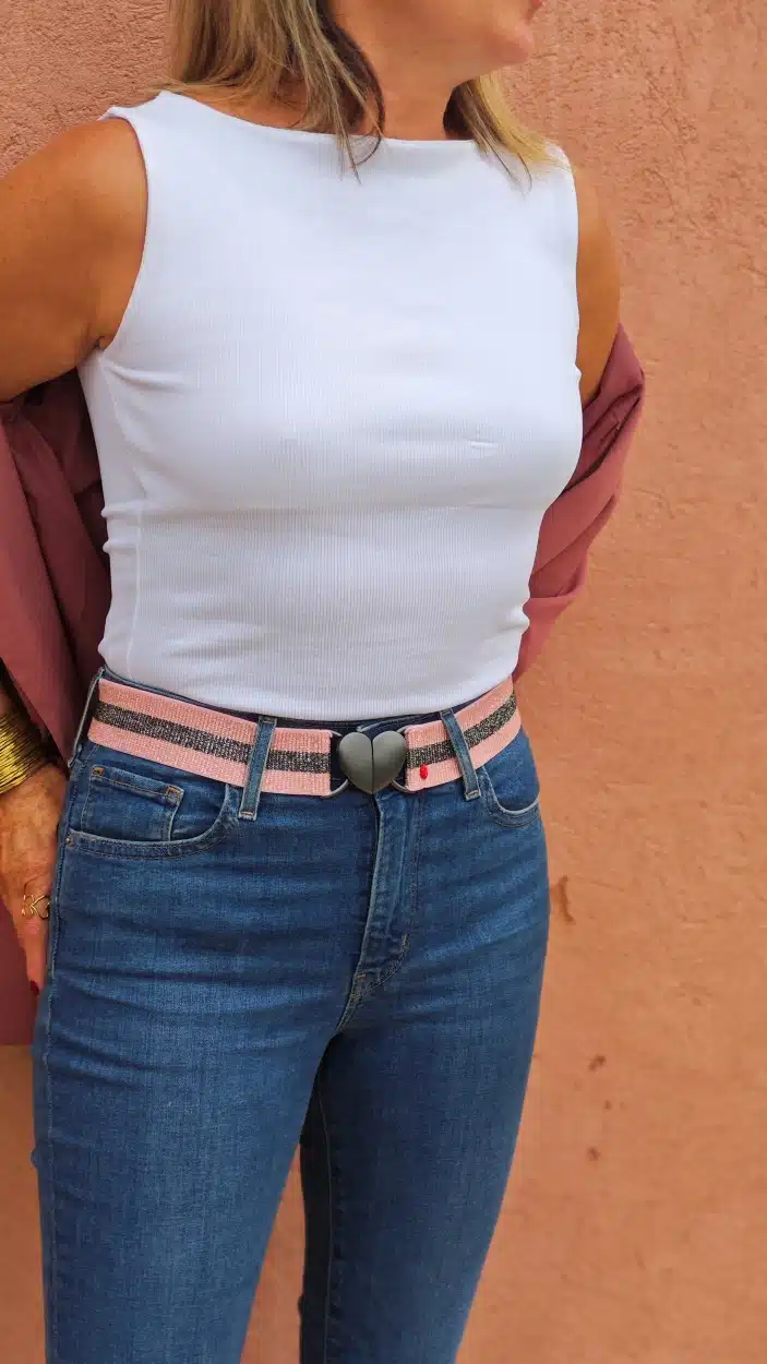 La ceinture élastique rose et grise Agatha combine confort, élégance et originalité.