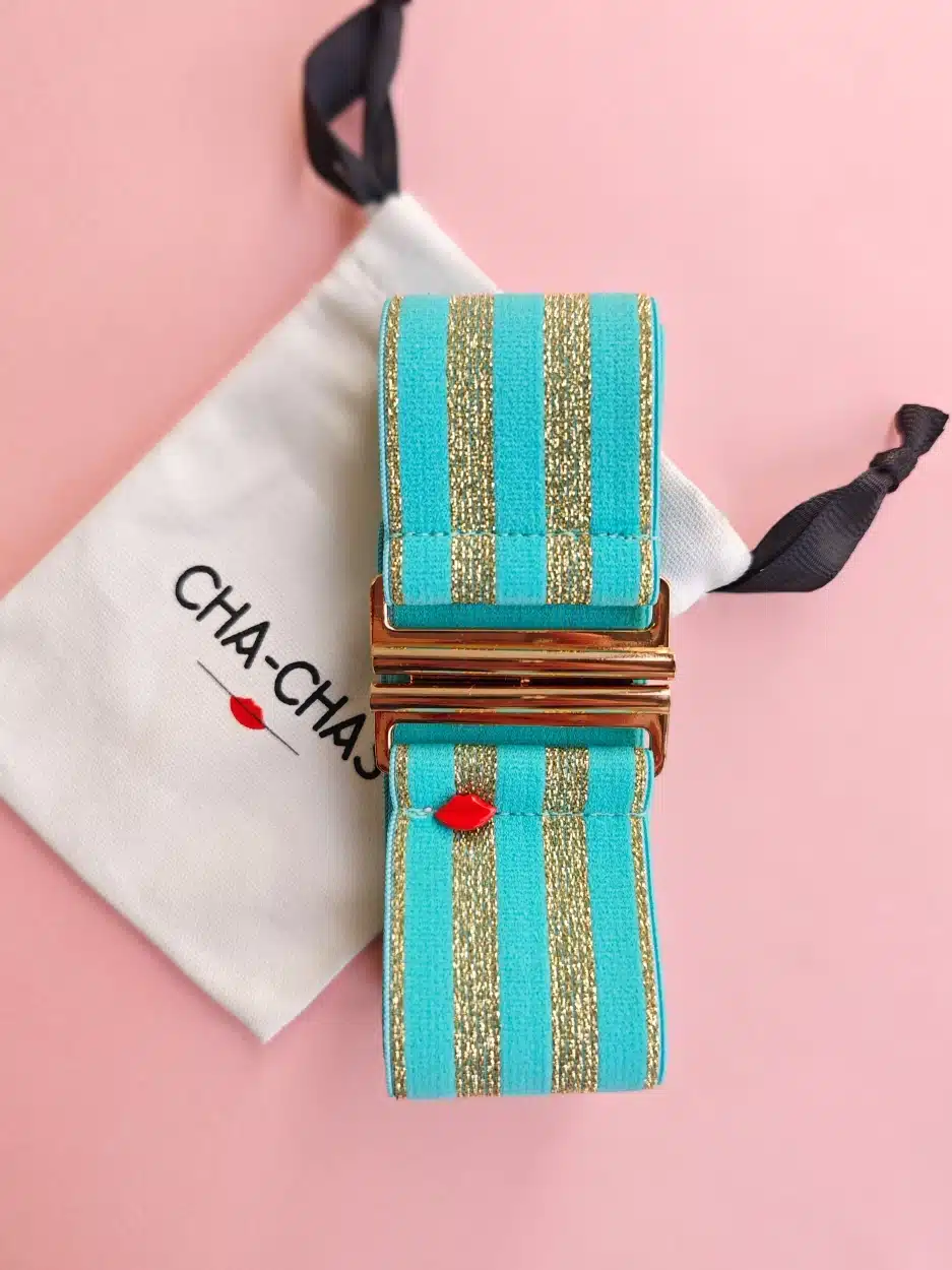 Pimpez votre tenue avec la ceinture élastique Célia bleu turquoise et dorée et affirmez un style exclusif.