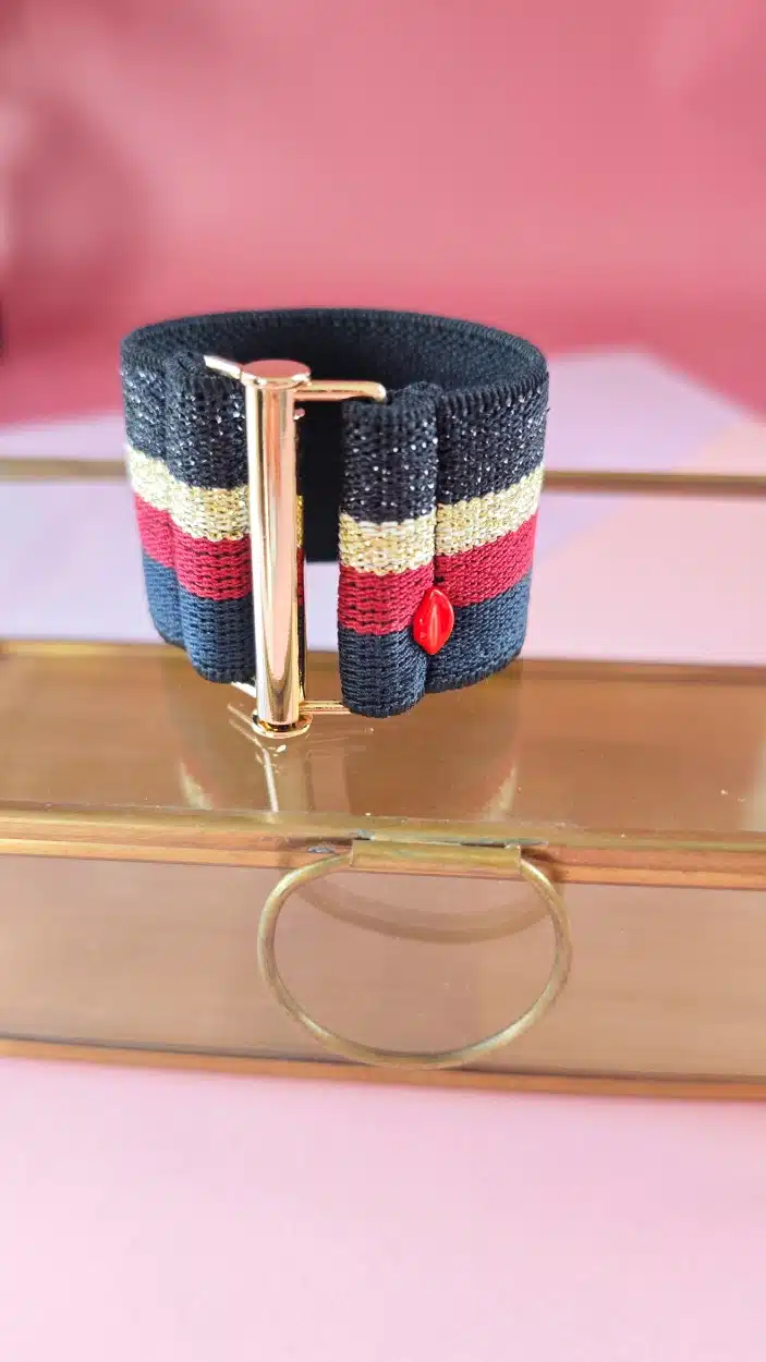 La manchette Ornella multicolore, c’est de toute évidence les couleurs tendance de l’automne, concentrées dans un accessoire à la fois chic et joyeux. En effet, ce bordeaux et ses bandes de lurex doré et noir pailleté, rehausse n’importe quelle tenue instantanément. Par conséquent, cette manchette va attirer tous les regards ! Si tu aimes les détails qui font la différence, Ornella est faite pour toi.