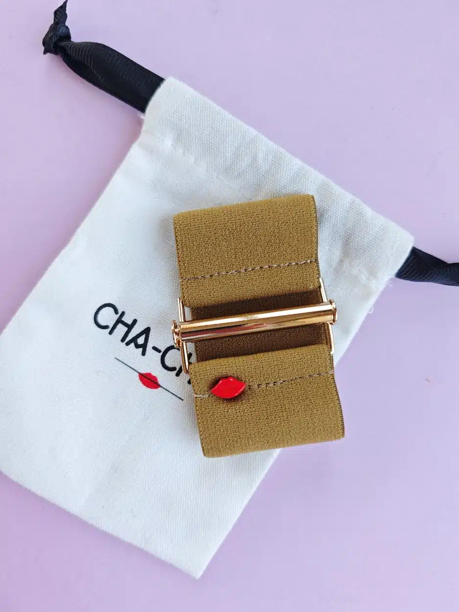 La fermeture par glissière dorée est facile à manipuler, même d’une seule main. Et évidemment, tu y retrouveras la petite signature Cha-Chas : le petit rivet en forme de bouche, laqué rouge, qui vient ajouter une touche de fantaisie discrète mais assumée.